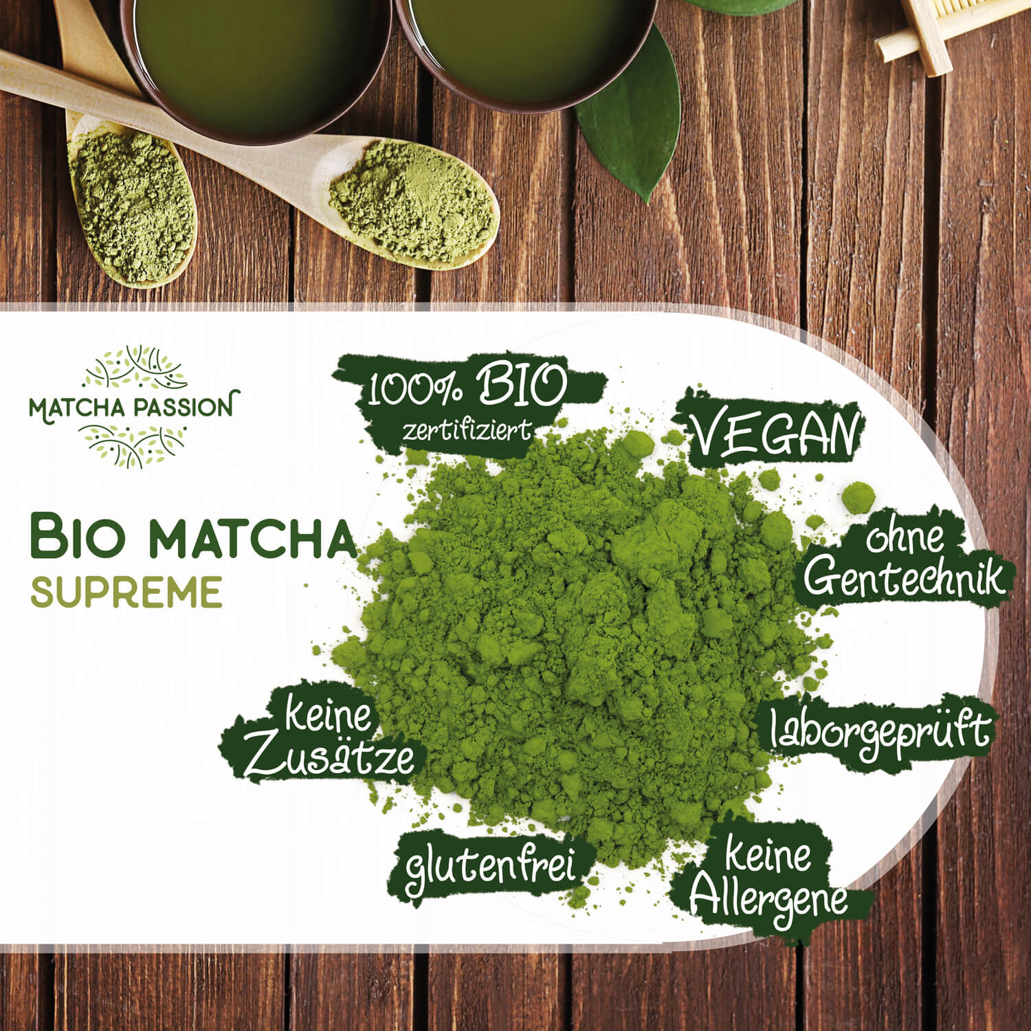 Falls Du auf der Suche nach hochklassigem purem Matcha Genuss bist, solltest Du Bio Matcha Supreme unbedingt ausprobieren.